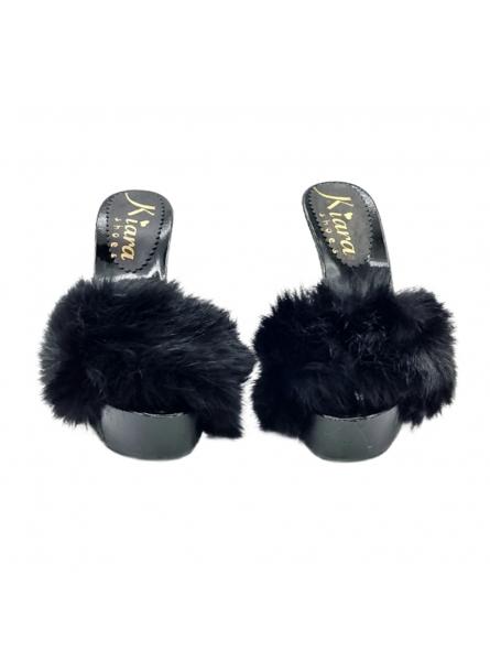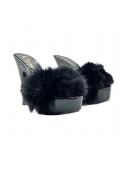 Handgefertigt in Italien, präsentieren sie eine glänzend schwarze Lackstruktur mit einem Obermaterial aus weichem Kunstfell für einen unwiderstehlich glamourösen Touch.