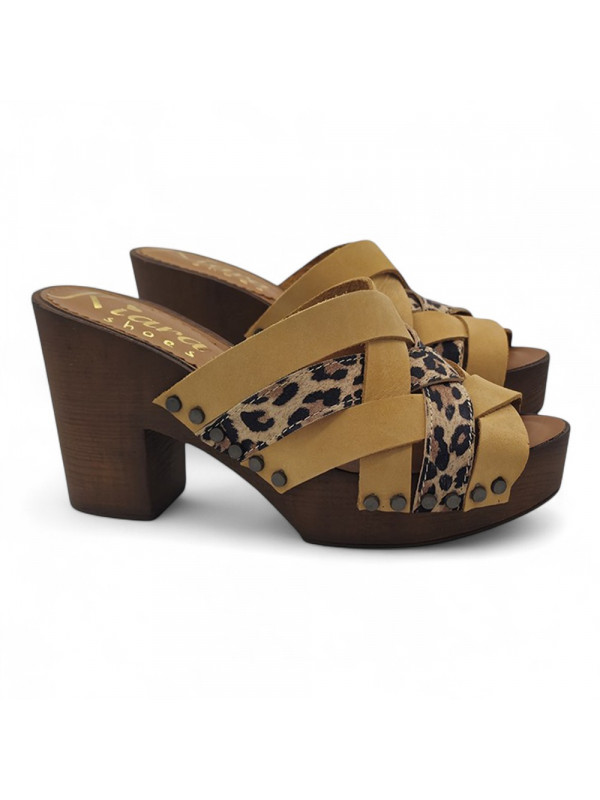 Handgefertigte Lederclogs mit geflochtenen Riemen und Leopardenmuster – 9,5 cm Absatz