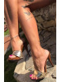 Holzeffekt Clogs mit Farbband aus goldenem Leder. Absatzhöhe 12 cm. Handwerkliche Verarbeitung. Stabil und bequem, werden sie vollständig in Italien hergestellt.