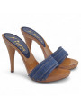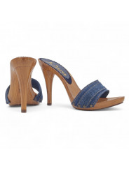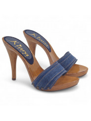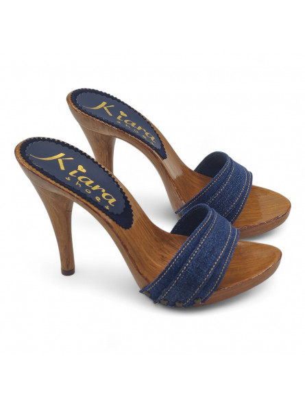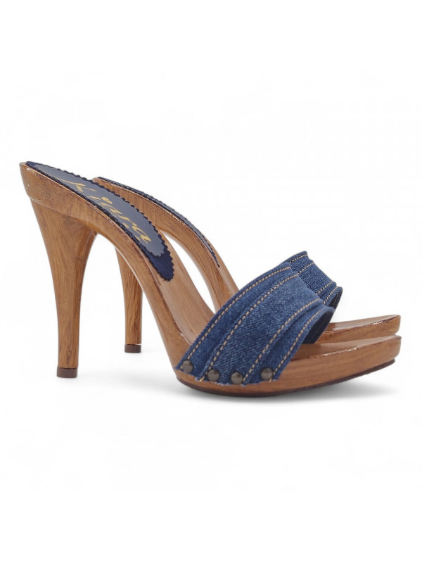 Holzeffekt Clogs mit doppeltem Farbband aus Jeans, sehr resistent. Absatzhöhe 12 cm. Handwerkliche Verarbeitung. Stabil und bequem, werden sie vollständig in Italien hergestellt.
