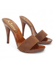 Holzeffekt Clogs mit Farbband aus Wildleder braun. Absatzhöhe 12 cm. Handwerkliche Verarbeitung. Stabil und bequem, werden sie vollständig in Italien hergestellt.