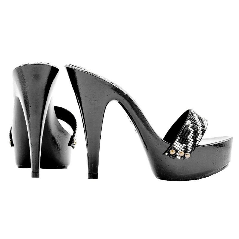 SCHWARZE CLOGS MIT STRASSBAND MIT ZEBRA-EFFEKT