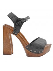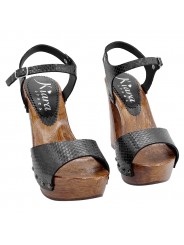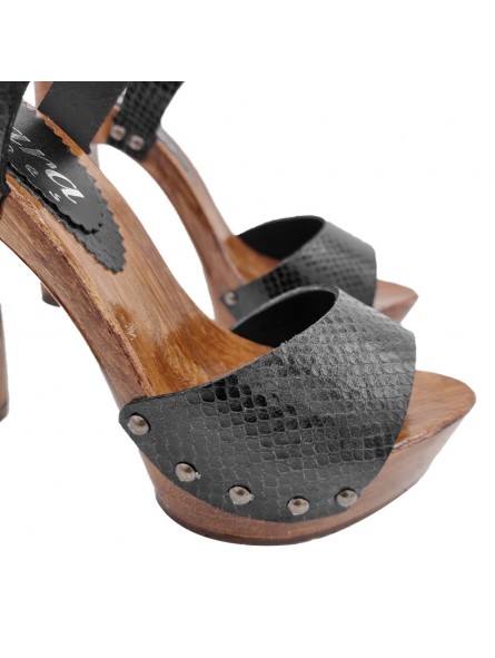 Design und Materialien: Handgefertigte Sandalen mit einem schwarzen Lederriemen im Python-Look und einer braunen Holzoptik-Sohle. Eine perfekte Kombination aus Eleganz und Modernität.