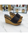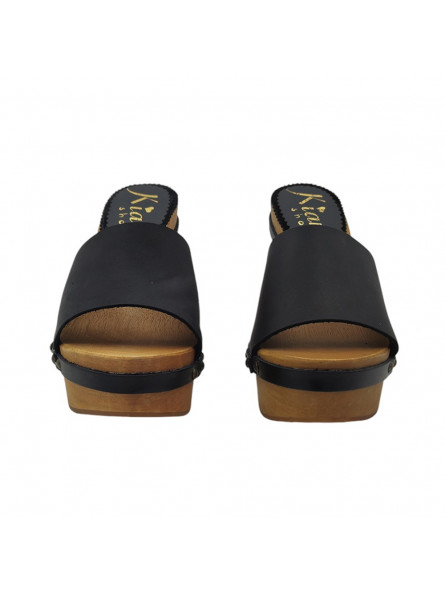 Schwarze Keilclogs aus echtem Leder und naturbelassenem Holz