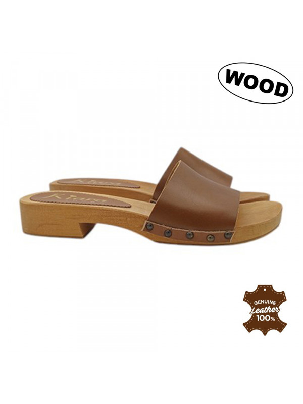 Clogs mit niedrigem Absatz aus braunem Leder und einer Holzsohle.
