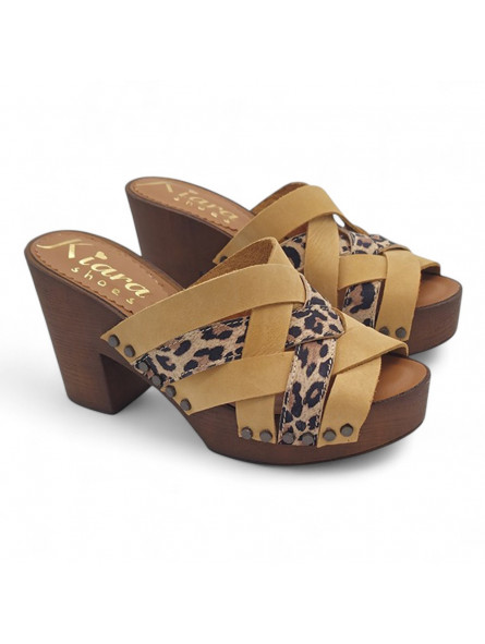 Handcrafted leather clogs with braided straps and leopard print – 9.5 cm heel
