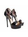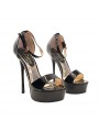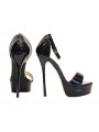 Women's sandals in patent leather with black upper and adjustable ankle strap, heel 14 cm and plateau 3,5 cm. Sandals for special occasions.