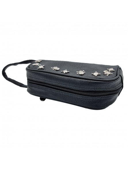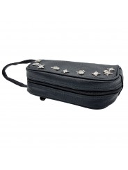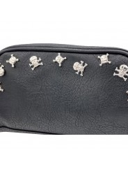 Cartera de mano unisex en piel sintética negra, adornada con pequeñas calaveras plateadas