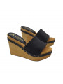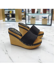 Zuecos artesanales hechos completamente en Italia, con tira de piel auténtica negra y base de madera natural.
