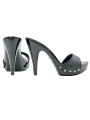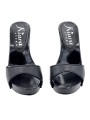 La base negra lacada se combina con una parte superior de cuero refinado y un tacón de aguja de 11 cm, equilibrado por una plataforma delantera de 2 cm.