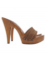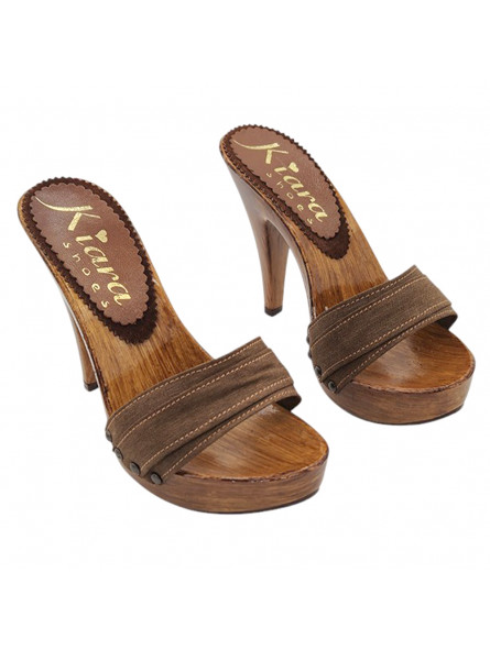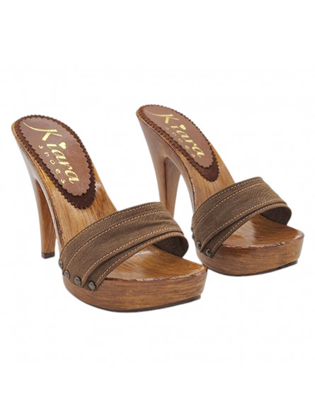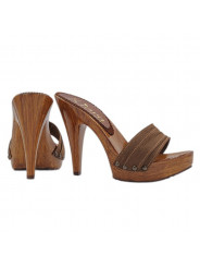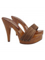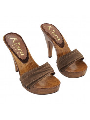 Realza tu estilo con estos elegantes zuecos de mujer hechos a mano en Italia. La estructura efecto madera aporta un aspecto refinado y moderno, mientras que la doble banda de tejido marrón envuelve el pie con comodidad y estabilidad.
