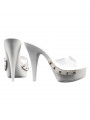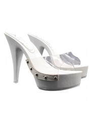 Base lacada en blanco, resistente y con diseño artesanal. Banda con efecto cristal transparente, para un look moderno y refinado. Tacón alto de 13cm con plataforma de 4cm, para una altura impresionante con mayor comodidad. Estable y cómodo, diseñado para un ajuste seguro incluso con tacones altos.