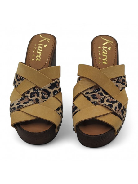 Zuecos artesanales de cuero trenzado con estampado de leopardo – Tacón de 9,5 cm