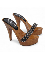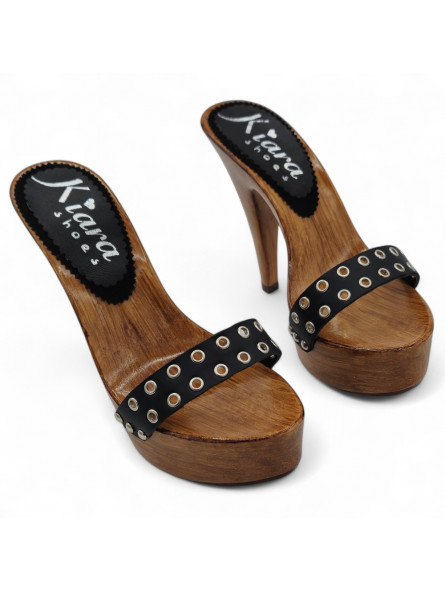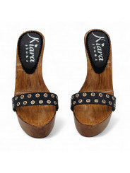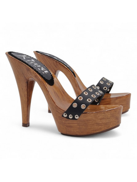 Zuecos de base con efecto de madera lacada, banda de doble color NEGRO con ojales con tacón de 13 cm + meseta de 4 cm- DESLIZANTE COLOR CANVAS NEGRO.ESTILO CASUAL GENIAL PARA EL VERANO COLLECION 100% MATERIALES NATURALES. CALZADO basado en el efecto de madera. Estable y confortable, está hecho completamente en Italia. Artesanías.