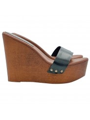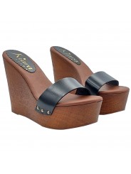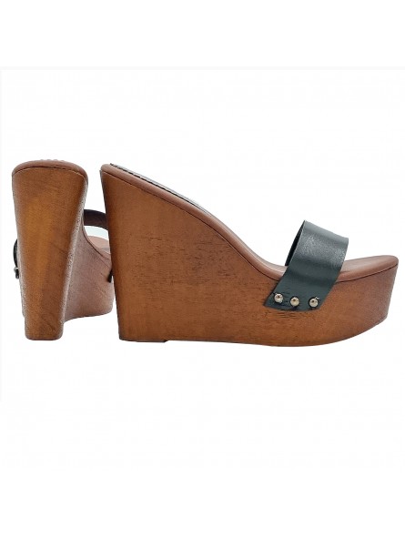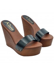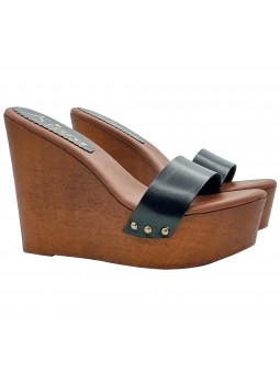 COMPENSÉES POUR FEMMES EN CUIR NOIR À TALONS HAUTS