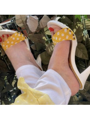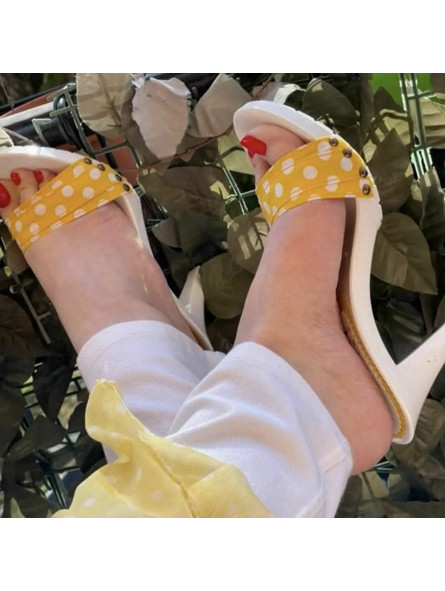 Sabots pour femmes avec talon de 9 cm, bande jaune a pois et structure laquée blanche. Traitement artisanal.