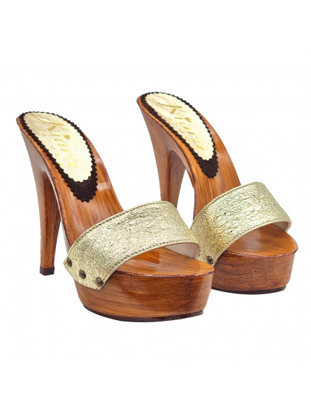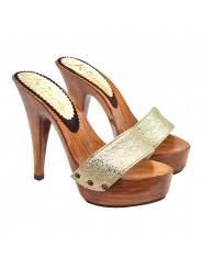 Sabots femme élégants avec bride en cuir doré laminé, parfaits pour sublimer toutes vos tenues estivales ou de soirée. La semelle marron effet bois laqué apporte une touche naturelle et raffinée, tandis que le talon haut de 13 cm avec plateau de 4 cm allonge la silhouette tout en assurant une marche stable et confortable.