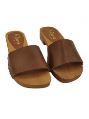Zoccoli con tacco basso realizzati in cuoio marrone con una suola di legno.