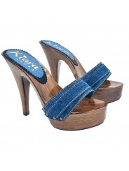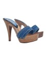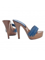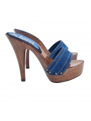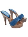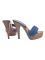 Zoccoli da donna con base effetto legno scuro e doppia fascia denim, tacco 13 cm + Plateau 4 cm. Stabile e comodo realizzato interamente in ITALIA. Lavorazione artigianale.
