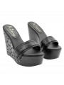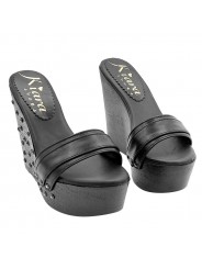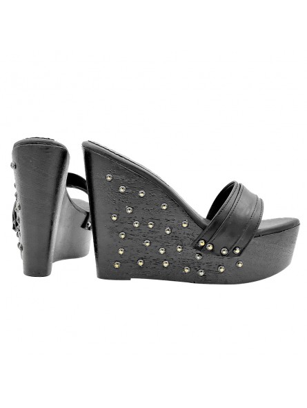 Zoccolo da donna con tacco 13 cm + plateau da 4 cm, e con tomaia nera. Applicazione di borchie sulla zeppa. Stabile e comodo realizzato interamente in ITALIA. Lavorazione artigianale.